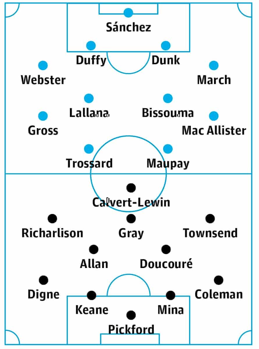 Bernard starts Richarlison on the bench Next 1 of 4 Prev post Use your arrows to browse Everton are set to welcome Brighton and Hove Albion at Goodison Park. Everton predicted lineup vs. Michael Keane Mason Holgate Jordan Pickford Seamus Coleman Lucas Digne Allan Richarlison Dominic Calvert-Lewin Abdoulaye Doucoure Demarai Gray Andros Townsend Prediction.